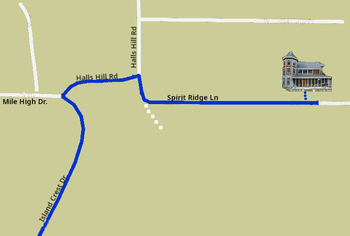 - Drive straight to the mailboxes and turn Right, then an immediate Left onto Spirit Ridge Lane.